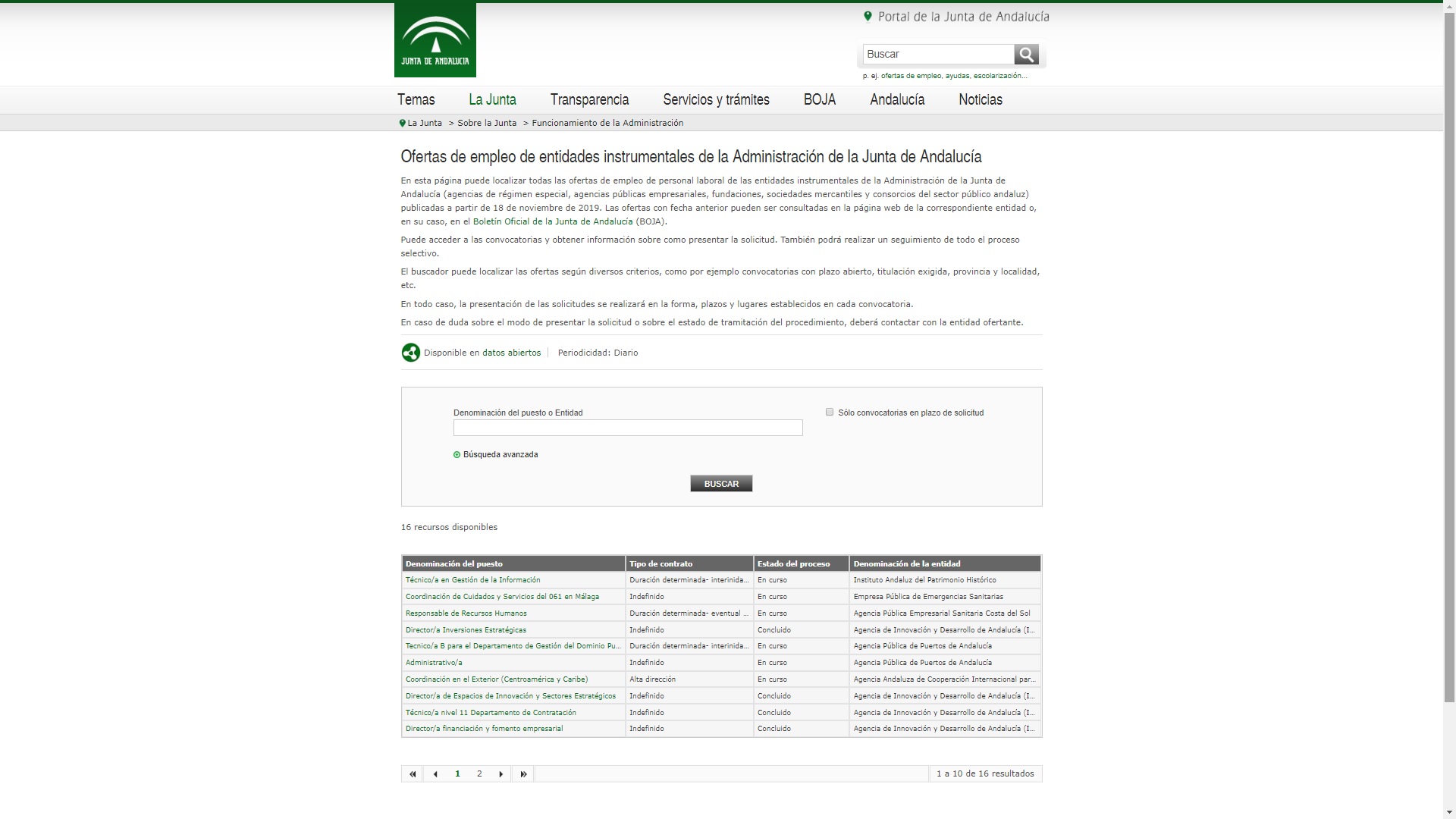 Con este nuevo buscador, la información está recogida en un único sitio, lo que facilita que desde un mismo enlace se pueda conocer todos los puestos que se ofertan. La herramienta estará alojada en la sección de Transparencia del portal de la Junta de Andalucía (www.juntadeandalucia.es/transparencia) y permite la búsqueda a través de distintos criterios, como la titulación exigida, tipo de contrato o la provincia.
