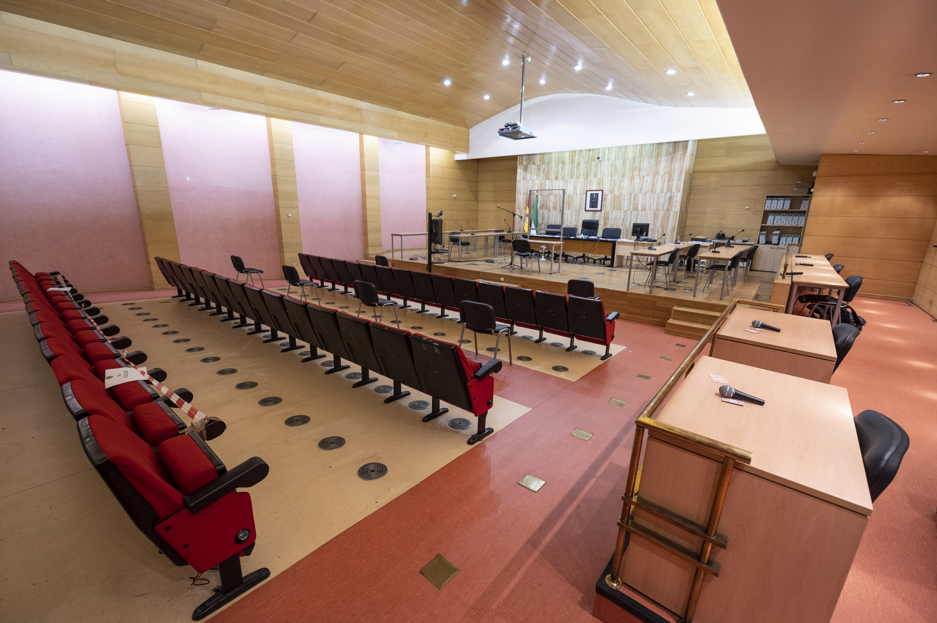 El resto de los intervinientes ocuparán el espacio que normalmente está destinado al público. Para ello se dispone de butacas en las que se situarán tanto los abogados de las defensas como los procesados, todos ellos a dos metros de distancia uno de otro. La prensa también contará con un espacio reservado en esta zona, donde los periodistas estarán sentados igualmente guardando la distancia de dos metros.