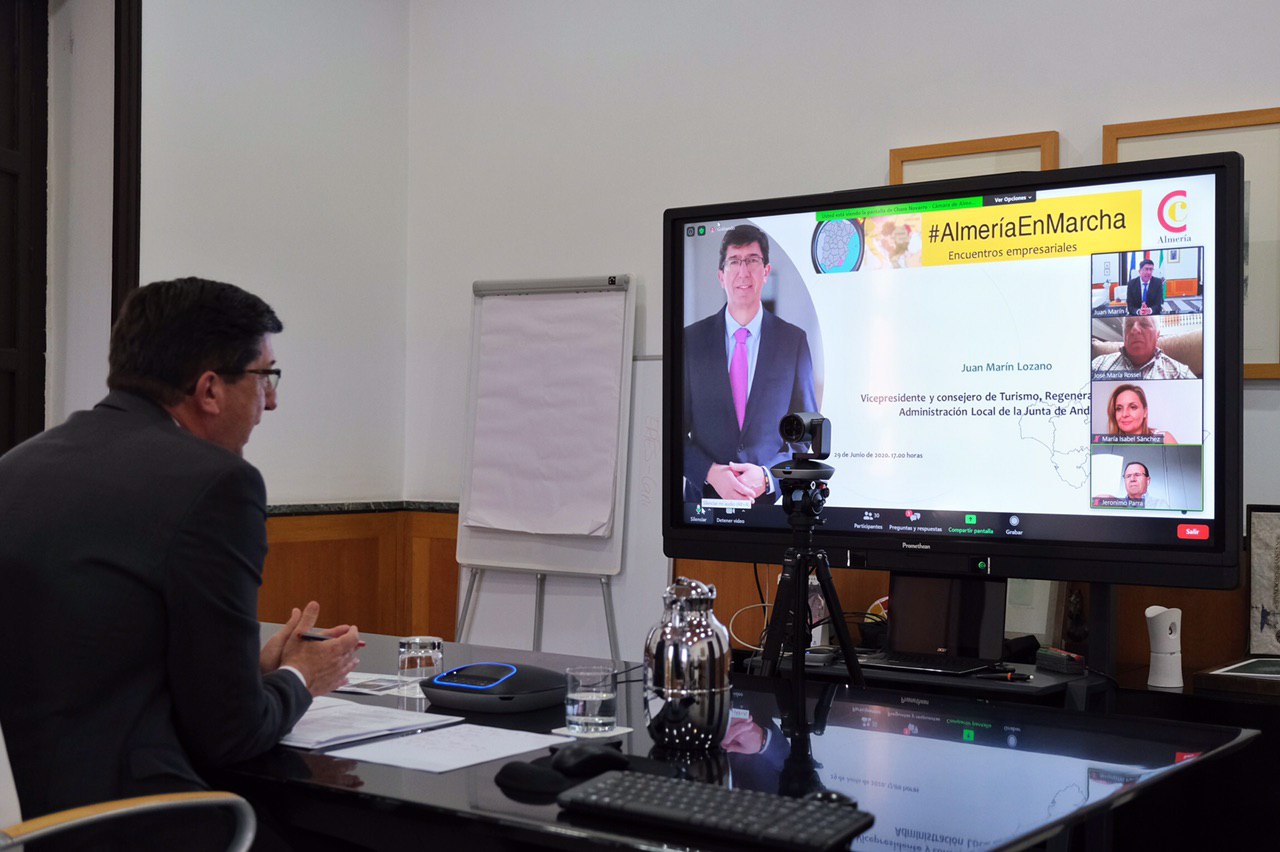 El vicepresidente de la Junta de Andalucía y consejero de Turismo, Regeneración, Justicia y Administración Local, Juan Marín, ha participado hoy en un Foro virtual organizado por la Cámara de Comercio de Almería. Durante el encuentro, ha manifestado el compromiso “especial” del Gobierno andaluz con esta provincia a la hora de reorientar las estrategias para afrontar la etapa post Covid.