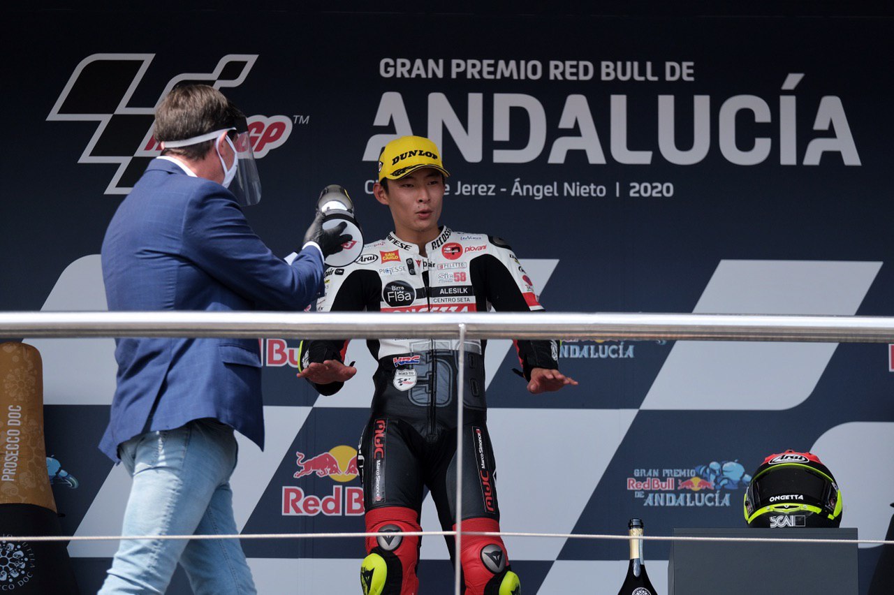 Juan Marín entrega el premio al ganador de Moto 3 en el Gran Premio de Andalucía de Motociclismo