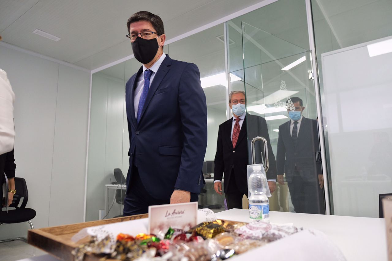 El vicepresidente de la Junta de Andalucía y consejero de Turismo, Regeneración, Justicia y Administración Local, Juan Marín, y el consejero de Transformación Económica, Industria, Conocimiento y Universidades, Rogelio Velasco, han visitado esta mañana la empresa Mantecados La Aurora de Estepa (Sevilla), en la que han destacado el compromiso por la innovación y el desarrollo de nuevos productos de las empresas del sector agroalimentario que se localizan en esta comarca de la provincia de Sevilla.