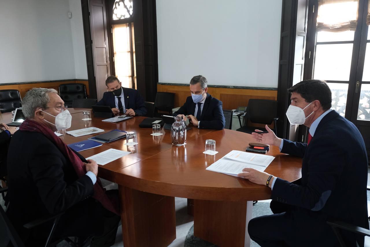 El vicepresidente y consejero de Turismo, Regeneración, Justicia y Administración Local, Juan Marín, acompañado del consejero de Hacienda y Financiación Europea, Juan Bravo, y el de Transformación Económica, Industria, Conocimiento y Universidades, Rogelio Velasco, han mantenido hoy un encuentro con el alcalde de Linares, Raúl Caro, para informar de las iniciativas en las que trabaja el Gobierno andaluz para la reactivación económica del municipio.