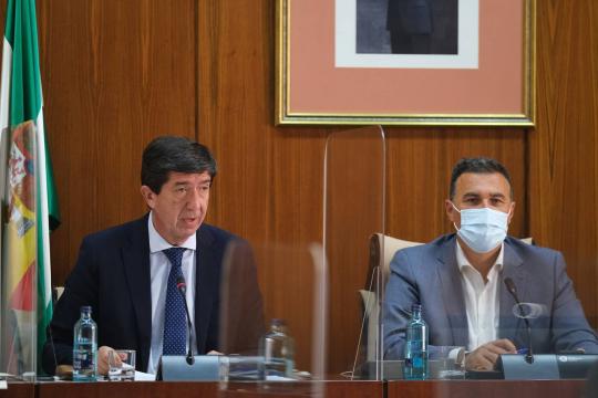 Juan Marín durante su comparecencia en la Comisión parlamentaria de la Consejería de Turismo, Regeneración, Justicia y Administración Local.