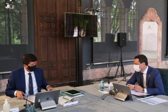 El presidente de la Junta, Juanma Moreno, junto al vicepresidente Juan Marín, durante la reunión del Consejo de Gobierno donde se ha aprobado el Decreto.