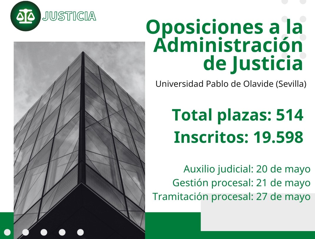 Más de 19.500 opositores se examinarán los días 20, 21 y 27 de mayo para acceder a 514 plazas de Auxilio Judicial, Gestión y Tramitación Procesal en los juzgados y tribunales andaluces. Los exámenes para los tres cuerpos, cuya organización corresponde a la Consejería de Justicia, Administración Local y Función Pública, se celebrarán en la Universidad Pablo de Olavide (UPO) de Sevilla.