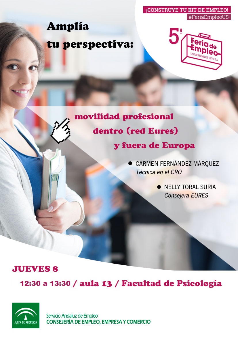 Mañana comienza una nueva edición de la Feria de Empleo de la Universidad de Sevilla en la que un año más el Servicio Andaluz de Empleo estará presente con un stand informativo y un taller específico sobre "Movilidad profesional dentro y fuera de Europa", que será impartido por la consejera de la Red Eures en Sevilla y una técnico de la red Andalucía Orienta.