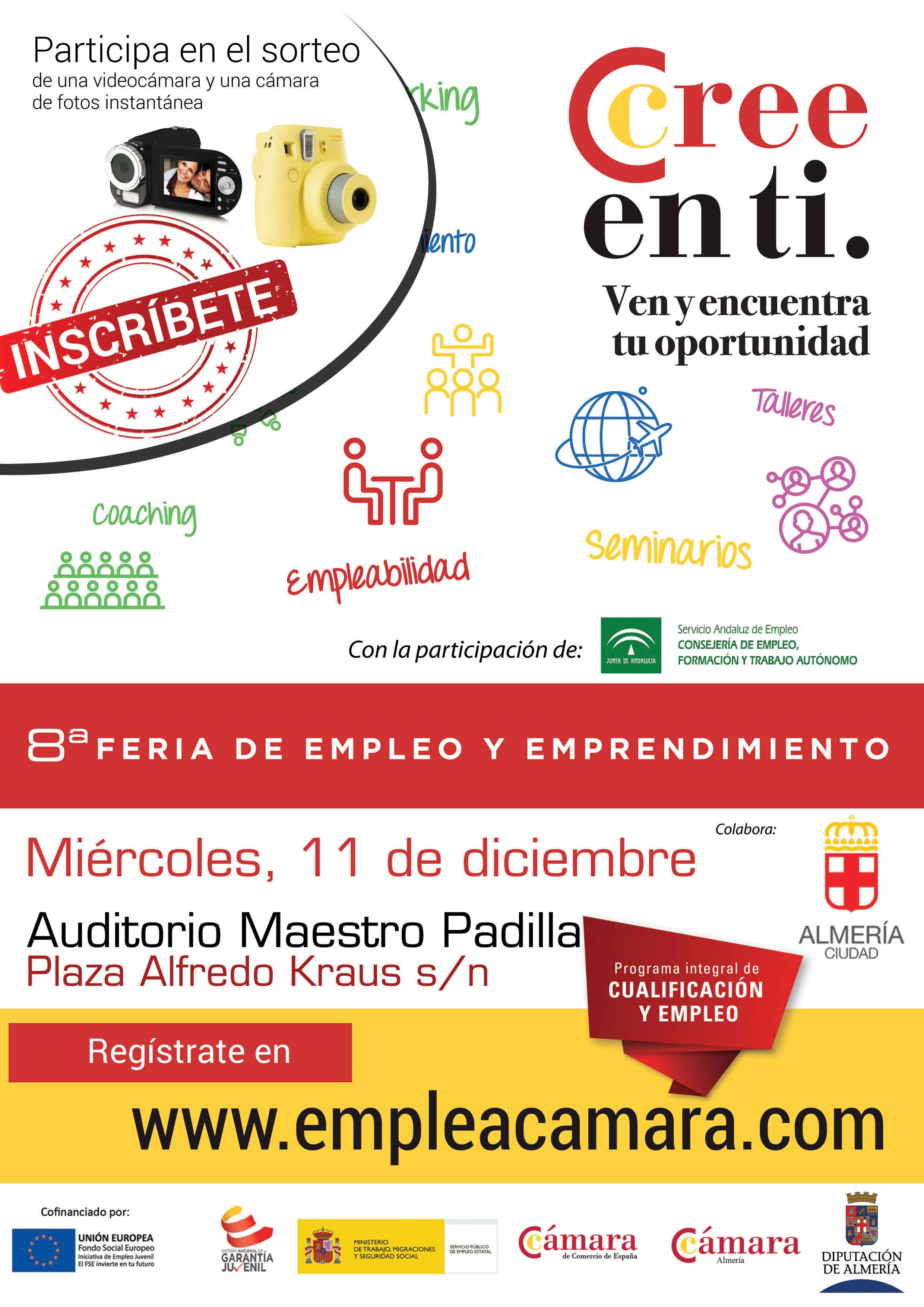 La participación es totalmente gratuita y está abierta al público en general si bien tendrán prioridad las personas menores de 30 años inscritas en el Sistema de Garantía Juvenil. La cita es en el Auditoria Maestro Padilla, Plaza Alfredo Kraus s/n de Almería y el taller del SAE se impartirá en el Aula 1, a las 13.00 horas. Quienes deseen participar, pueden consultar el programa completo e inscribirse en los talleres a través de la web específica del evento www.empleacamara.com.