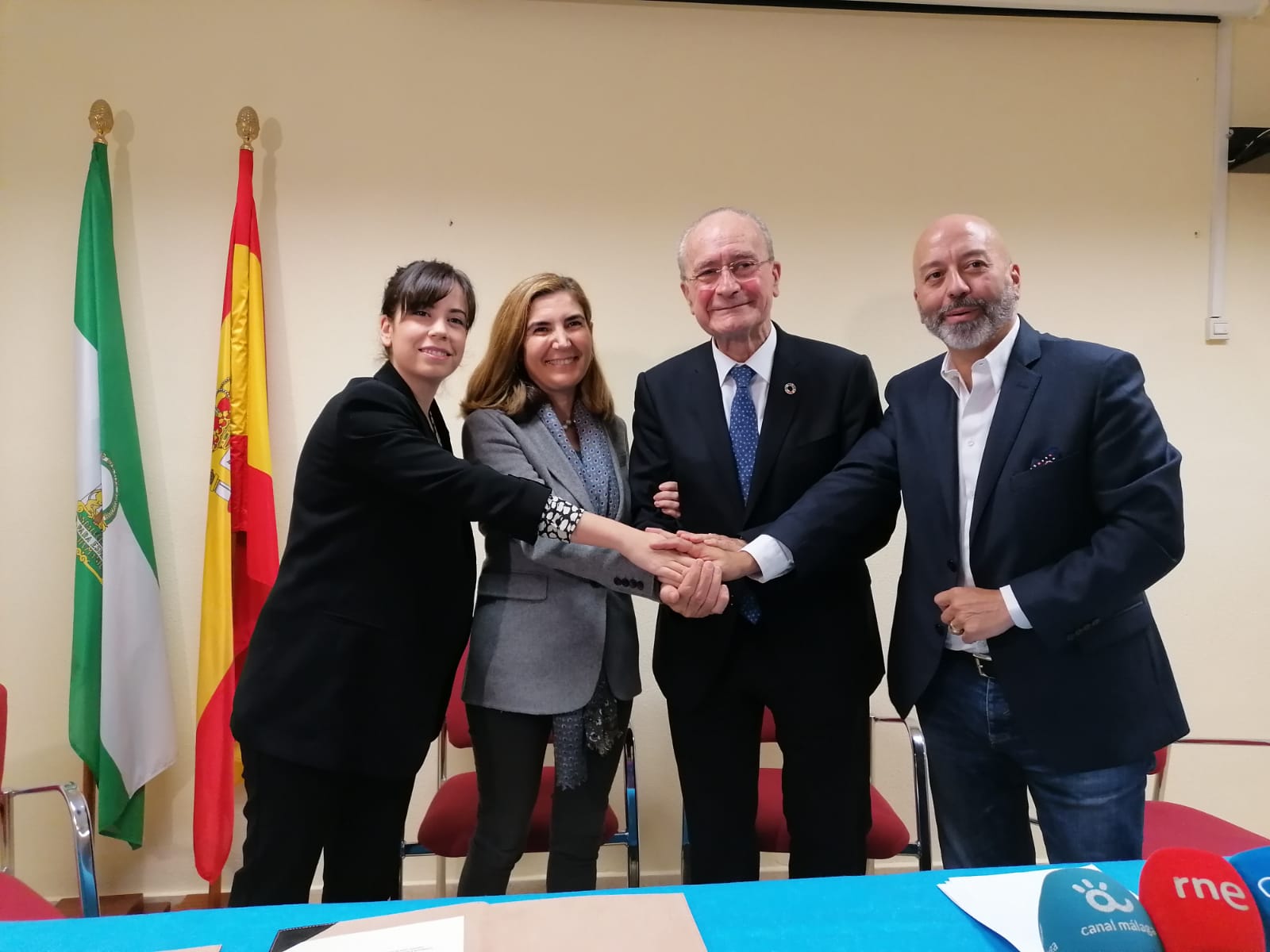 La consejera de Empleo, Formación y Trabajo Autónomo, Rocío Blanco; la directora del Área de Empleo y Emprendimiento de la Fundación Santa María la Real, Natalia Serrano; y el director de Relaciones Institucionales en Fundación Telefónica, Joan Cruz, han presentado hoy en Málaga el proyecto Lanzaderas Conecta Empleo, un nuevo modelo de orientación laboral que cambia la estructura de las actuales Lanzaderas de Empleo para ofrecer dos grandes actividades: “Alfabetización Digital” y “Lanzadera Conecta Empleo”