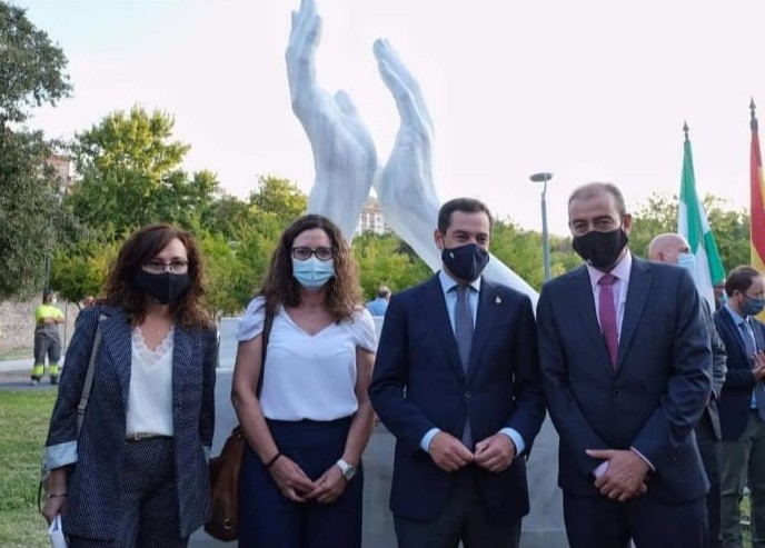 La escultura en homenaje a los profesionales que trabajan para frenar la pandemia de la COVID-19 realizada por la Escuela del Mármol de Fines ya luce en la calle Fuente del Serbo de la capital jienense, tras el acto de inauguración realizado ayer por el presidente de la Junta de Andalucía, Juan Manuel Moreno Bonilla y al que han asistido la directora del centro, Juana Colmenero, y el presidente y la directora general de la Asociación de Empresarios del Mármol de Andalucía (AEMA), Jesús Posadas y Teresa Tijeras, respectivamente.