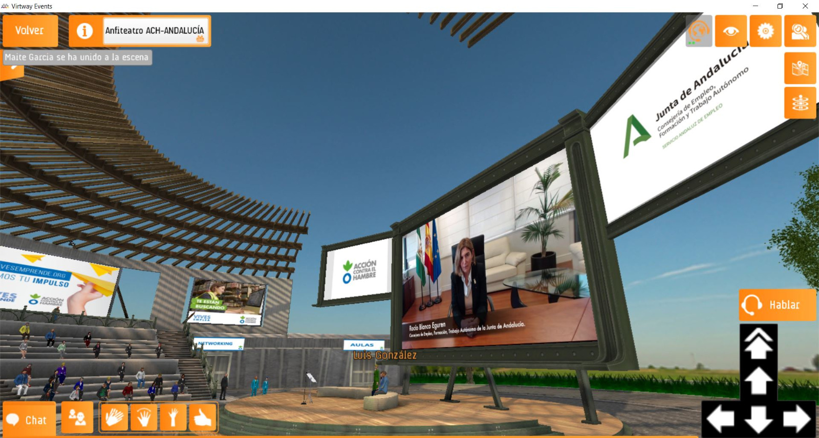 Los asistentes a este evento online tienen su propio avatar, con el que se mueven por las distintas salas para acudir a los talleres -por ejemplo, Transformación digital y empleo inclusivo u Oportunidades de empleo en el sector logístico-, al espacio de emprendedores -dedicado para aquellas personas interesadas en lanzar su propia idea de negocio-, escuchan la charla motivacional, que les ayudan a impulsar su empleabilidad, y asisten a la feria de empleo, con stands y personal de distintas empresas ubicadas en Andalucía que cuentan con ofertas de empleo abiertas.