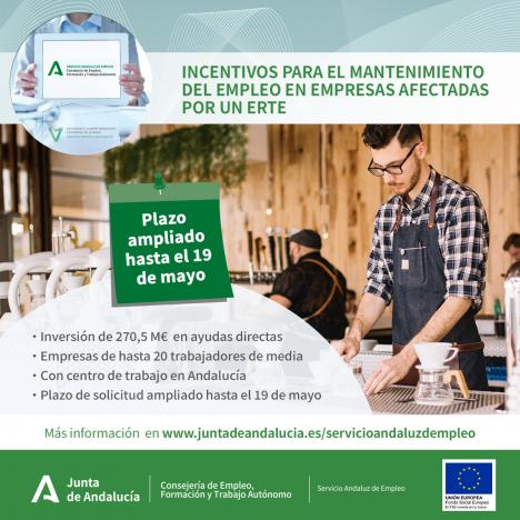 El Consejo de Gobierno ha aprobado una ampliación hasta el 19 de mayo del plazo para que las empresas andaluzas afectadas por un ERTE presentado a partir de la declaración del estado de alarma soliciten las ayudas para el mantenimiento del empleo. Hasta el momento, estas ayudas cuentan con más de 32.000 solicitudes presentadas para 122.000 trabajadores. En un principio, el
