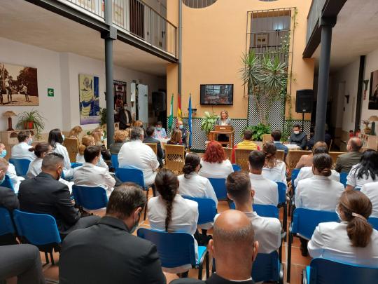 La consejera de Empleo, Formación y Trabajo Autónomo, Rocío Blanco, ha participado hoy en un acto de bienvenida para los 30 nuevos alumnos que arrancaron el pasado mes de octubre su formación en la Escuela de Hostelería de Málaga La Cónsula, un centro adscrito al Servicio Andaluz de Empleo (SAE) que proporciona formación profesional a personas desempleadas a la medida de las demandas de las empresas del sector del turismo y la hostelería. Los nuevos alumnos participan en los itinerarios de Cocina y Servicio de Restaurante, una formación de dos años de duración con la que obtendrán un certificado de profesionalidad y que alcanza en esta escuela un porcentaje de inserción del 100% en ediciones anteriores.