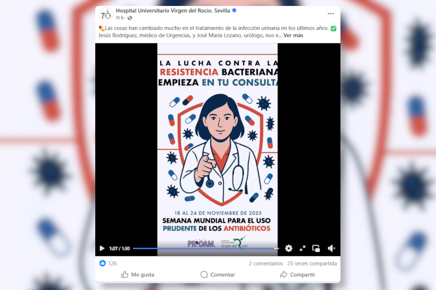 El Hospital Universitario Virgen del Rocío (HUVR) ha puesto en marcha una campaña de videos formativos bajo el lema ‘La lucha contra las resistencias empieza en tu consulta’ coincidiendo además con la reciente celebración del Día Europeo para el Uso Prudente de los Antibióticos.