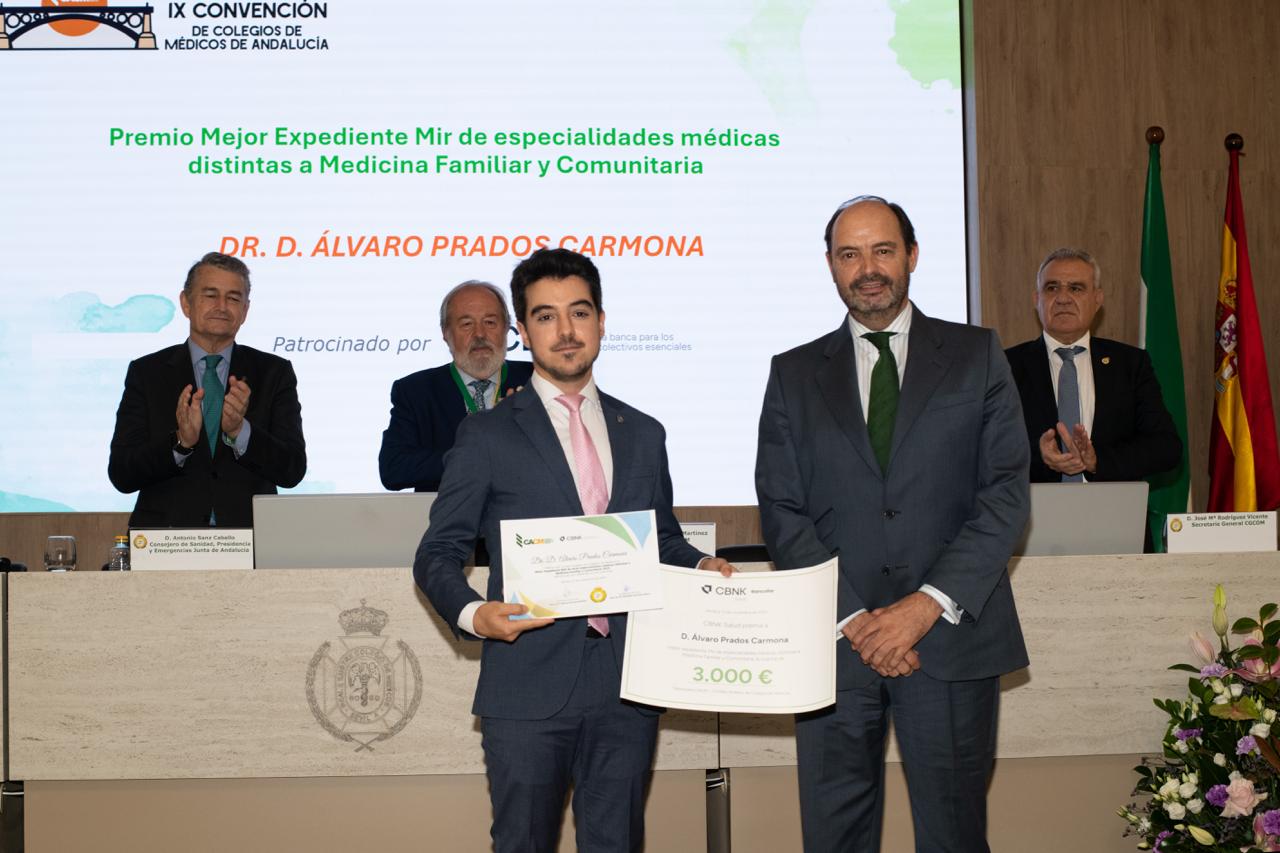 El dermatólogo Álvaro Prados Carmona, médico residente del Clínico San Cecilio, ha recibido el Premio al Mejor Expediente MIR de Especialidad Médica otorgado por el Consejo Andaluz de Colegios de Médicos (CACM). Este reconocimiento de la organización colegial premia la excelente trayectoria académica, profesional e investigadora de los jóvenes médicos de Andalucía.