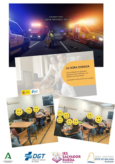 Un total de 125 alumnos de 4º de la ESO del IES `Salvador Rueda´ de Vélez Málaga han participado en el “Escape Room: la hora de oro”, una actividad práctica en la que se recrea el escenario de un accidente de tráfico durante los 60 minutos posteriores al siniestro, conocidos como "la hora de oro", donde una intervención eficiente es de vital importancia.