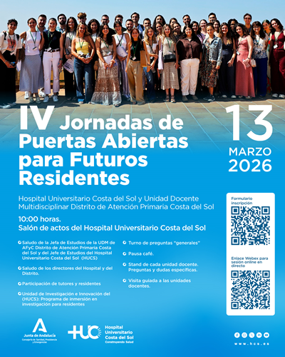 El Hospital Universitario Costa del Sol y el Distrito de Atención Primaria Costa del Sol, pertenecientes al Servicio Andaluz de Salud (SAS) de la Consejería de Sanidad, Presidencia y Emergencias, celebrarán este viernes, 13 de marzo, en el salón de actos del hospital, una jornada de puertas abiertas dirigida a futuros residentes. El objetivo es que conozcan muy de cerca los servicios y unidades del hospital y de los centros de salud del Distrito para que los elijan como lugares para llevar a cabo su formación.