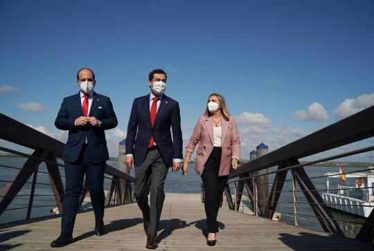 El presidente de la Junta de Andalucía, Juanma Moreno, ha incidido hoy en el papel clave que desempeñan los puertos andaluces como revulsivos económicos, turísticos, paisajísticos y de negocio, a la vez que ha destacado la apuesta del Gobierno andaluz, con una inversión que asciende a cerca de los 34 millones de euros, para contribuir a que los puertos sean activos de primer orden y de los que 5,6 millones corresponden a la provincia de Huelva. Concretamente, ha especificado que entre 2019 y 2020 se han invertido en los puertos andaluces más de 19 millones de euros, a los que se suman las actuaciones puertociudad que se han puesto en marcha este año por un importe de 11 millones y los 3,61 millones que se activarán en los próximos meses. “Un esfuerzo presupuestario muy importante para que las localidades con puerto puedan exprimir todo su potencial”, ha agregado, como es el caso de Isla Cristina, Mazagón, Lepe, Adra, Roquetas, Estepona, Marbella, Barbate, Rota, Chipiona, Conil y ahora Ayamonte. Moreno, que ha asistido a la inauguración de las obras de reurbanización de la Ribera del Guadiana en el municipio onubense de Ayamonte junto a la consejera de Fomento, Infraestructuras y Ordenación del Territorio, Marifrán Carazo, ha aseverado que estas obras tendrán un papel clave en lo económico, en lo turístico, en lo medioambiental y en lo social porque van a permitir a Ayamonte mirar al Guadiana desde esta nueva plataforma-mirador de 350 metros cuadrados en dos niveles y suspendida sobre el agua.
