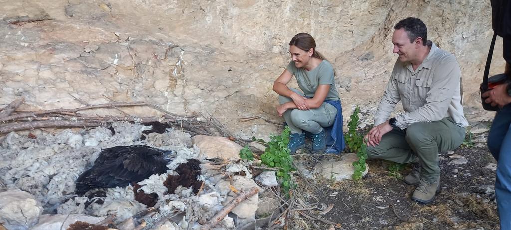 El director general de Política Forestal y Biodiversidad, Juan Ramón Pérez, y la delegada territorial de la Consejería de Sostenibilidad, Medio Ambiente y Economía Azul, María José Lara, han participado en la suelta de estos dos ejemplares de pollos de quebrantahuesos en el Parque Natural de las Sierras de Cazorla, Segura y Las Villas lugar seleccionado como prioritario y estratégico desde 2006 para la suelta de ejemplares.