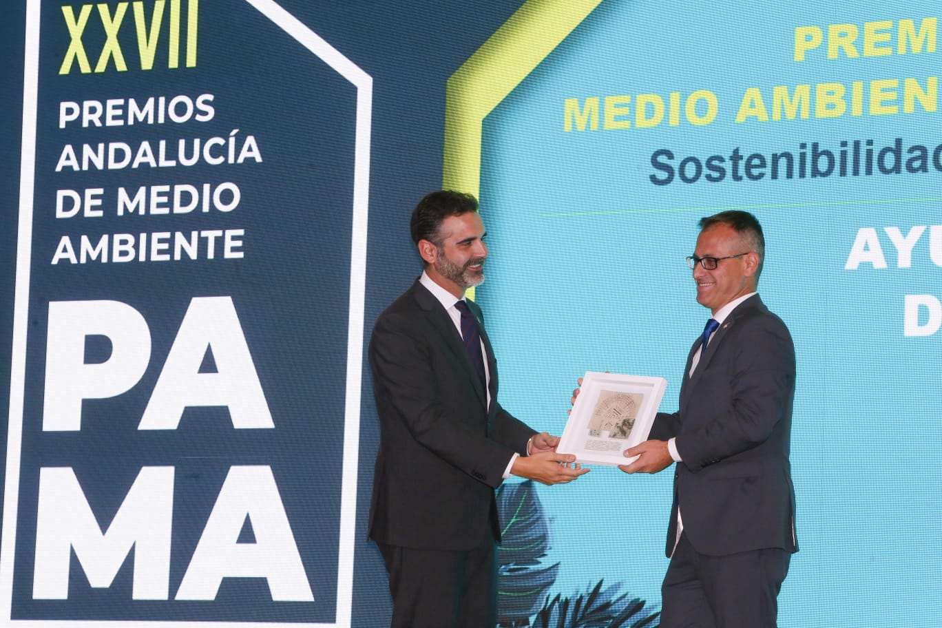 El consejero de Sostenibilidad entregando uno de los Premios Andalucía de Medio Ambiente