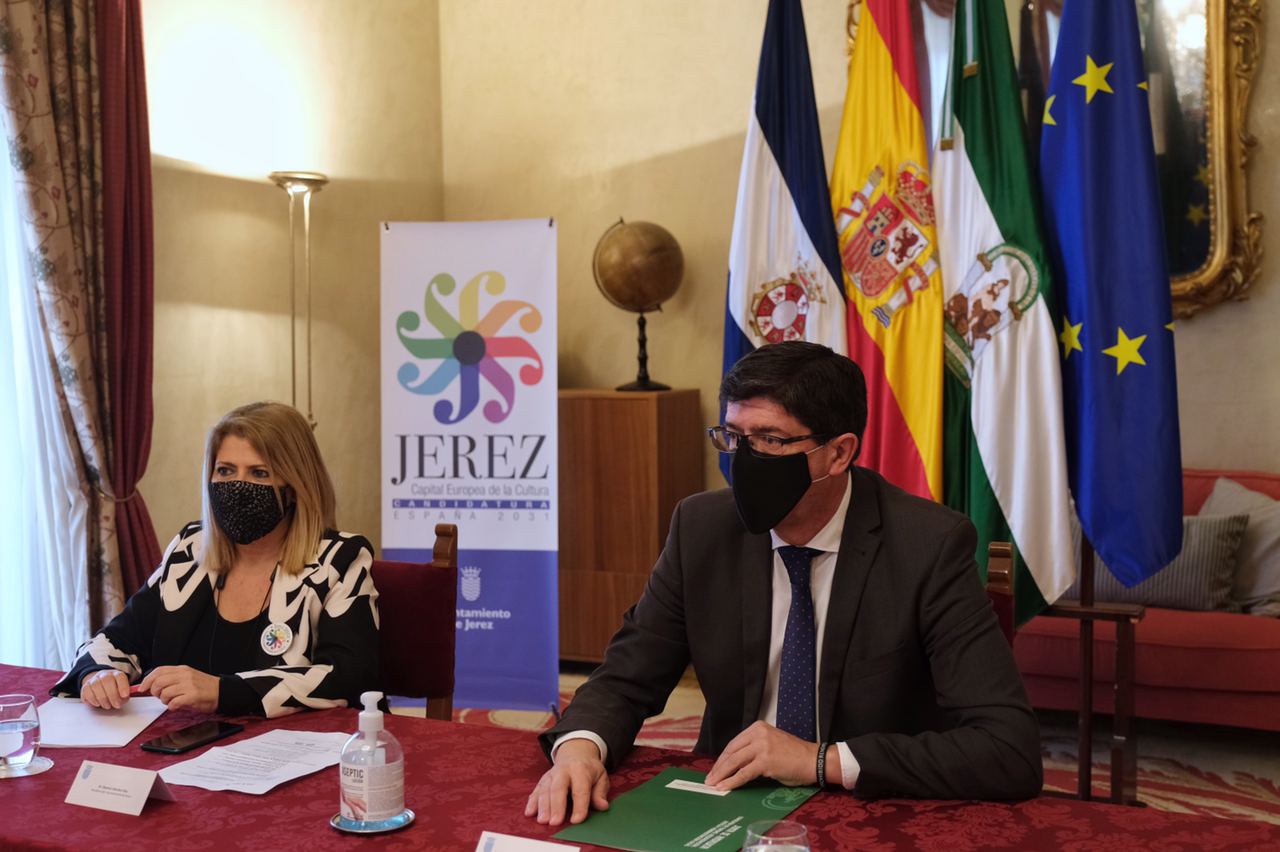 Juan Marín junto a la alcaldesa de Jerez, Mamen Sánchez, durante la reunión para abordar el Plan Turístico de Grandes Ciudades