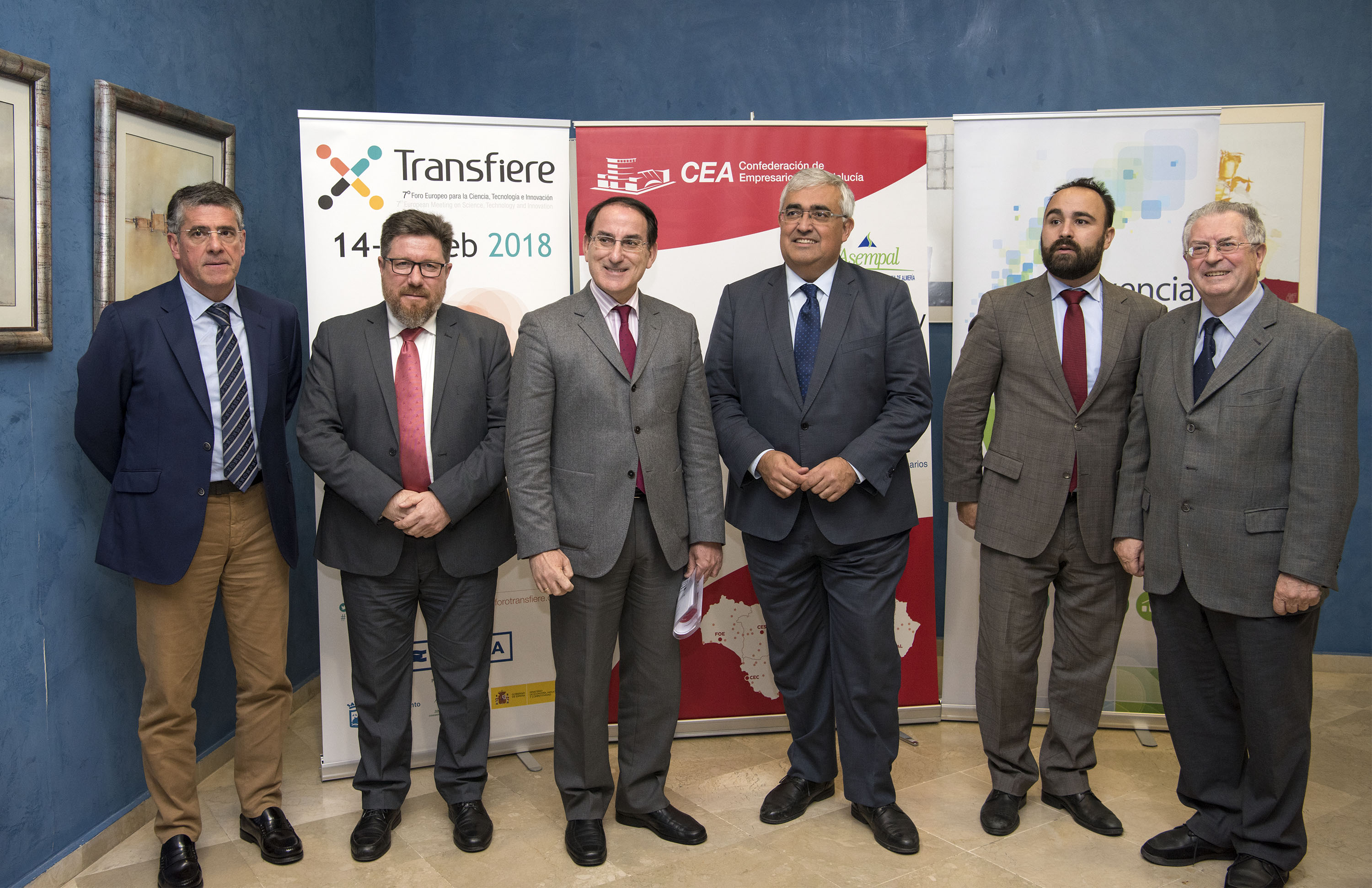 Los consejeros de Economía y Conocimiento, y Agricultura, Pesca y Desarrollo Rural, Antonio Ramírez de Arellano y Rodrigo Sánchez Haro respectivamente; el presidente de la Confederación de Empresarios de Andalucía (CEA), Javier González de Lara; el subdirector general de Fomento de la Innovación en el Ministerio de Economía, Industria y Competitividad, Juan Manuel Garrido; el concejal de Innovación y Nuevas Tecnologías del Ayuntamiento de Málaga, Mario Cortés, y el presidente de la Asociación de Parques Científicos y Tecnológicos de España (APTE), Felipe Romera, han presentado hoy ante empresas y medios de comunicación los contenidos de la séptima edición de Transfiere, Foro Europeo para la Ciencia, Tecnología e Innovación, el principal evento español sobre I+D+i. Así, durante los días 14 y 15 de febrero, el encuentro convertirá a Andalucía durante dos jornadas en punto de encuentro internacional para profesionales y representantes públicos vinculados a la innovación.