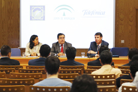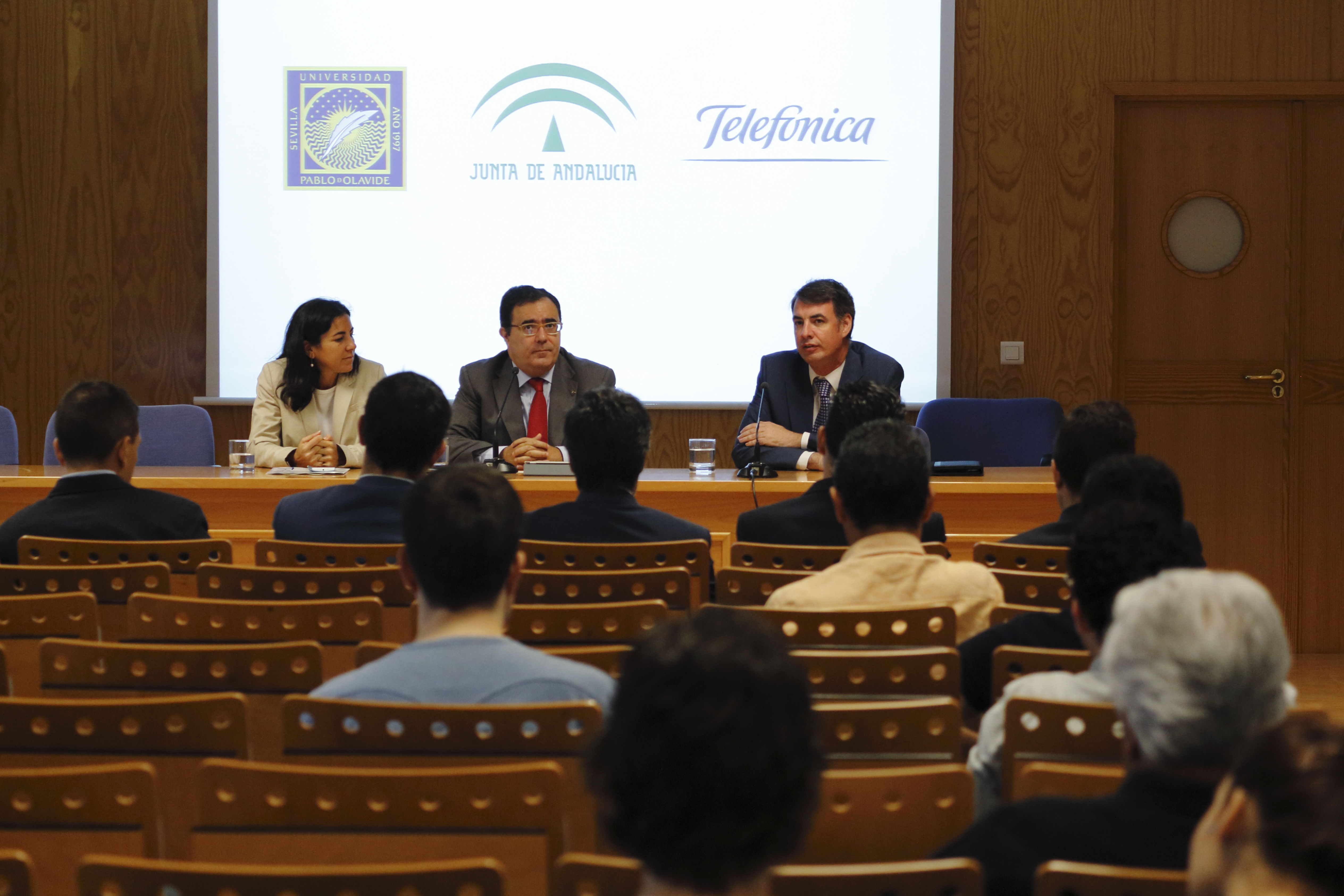 El secretario general de Innovación, Industria y Energía, Vicente Fernández, el rector de la Universidad Pablo de Olavide (UPO), Vicente Guzmán, y la directora de Territorio Sur de Telefónica España, María Jesús Almazor, han presentado hoy en la UPO el programa ‘Talentum Starups’, un programa de becas impulsado por la Junta de Andalucía y Telefónica que los estudiantes universitarios sevillanos podrán solicitar hasta el 23 de mayo.